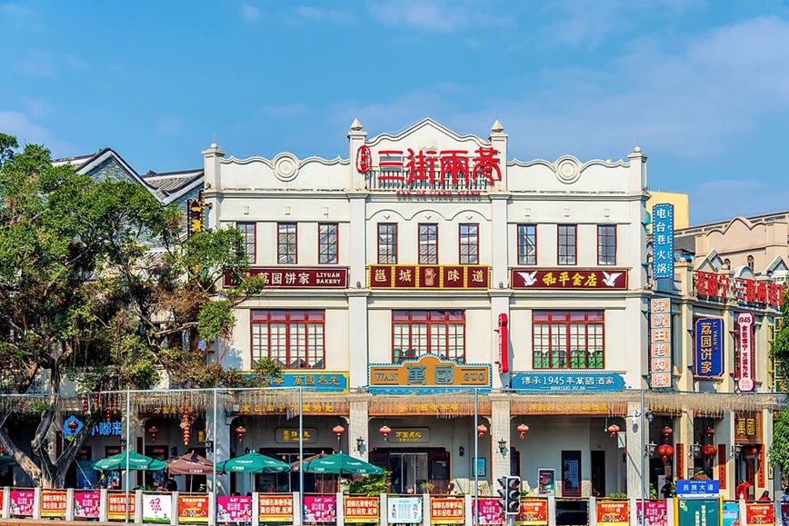 この外廊式の建築様式はインドに起源を持ち、やがてシンガポールやマレーシアで広まり、華僑によって中国本土へと持ち帰られたものだ。中華の建築構造と融合し、独自の姿を生み出した。店主はいまも「店の前で商い、奥で暮らす」昔ながらの形を守り、買い物客は日差しを避けながら廊下の下を歩く。こうして、古き“三街二巷”には、伝統とモダンがやわらかく溶け合っている。
