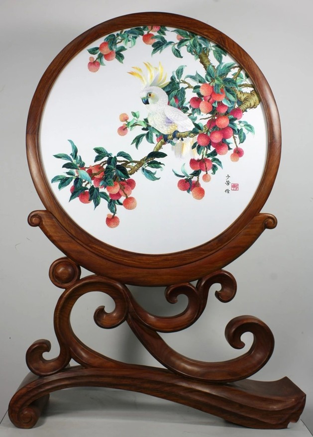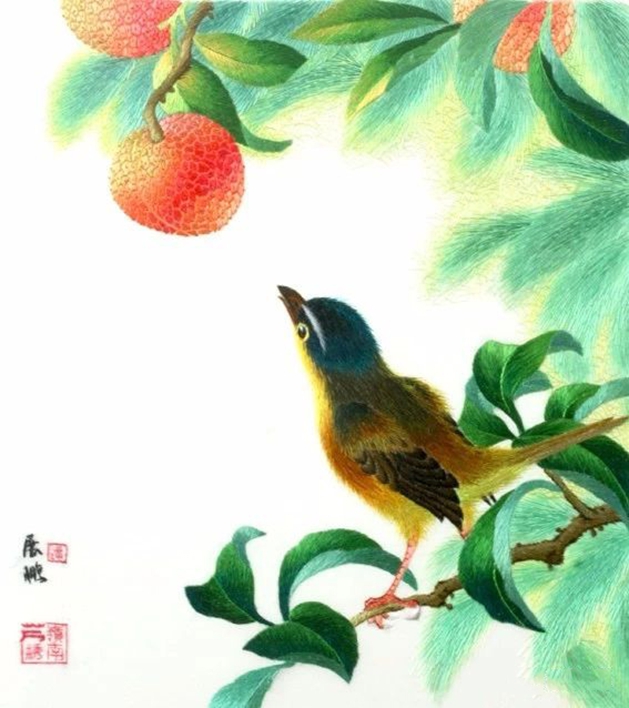 嶺南の職人たちの手にかかれば、荔枝は早くから「文化のトップスター」であた。粤秀(広州刺繍)で針を使って刺繍された荔枝は、近くで見ると殻の模様まで数えられるほど精巧で、遠くから見ると3Dプリントのようである。代表作『紅荔鸚鵡』や『荔香濃』などの作品は、国賓への贈り物として使われたこともある。