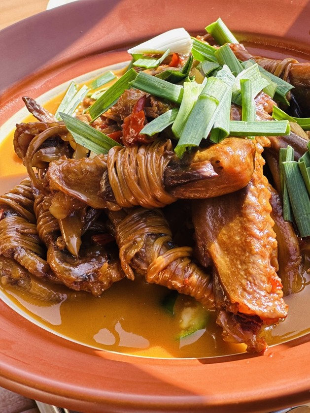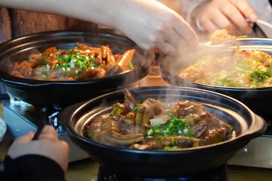 正午、通りは車で埋め尽くされ、各飲食店の席は満席である。食卓には、牛肉と春雨の鍋、若鶏と栗の鍋、魚の頭と豆腐の鍋など、看板メニューの広徳風煮込み鍋が並び、見た目も香りも味も申し分ない。