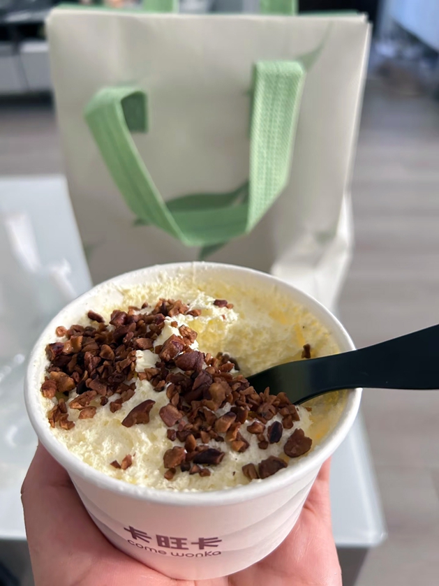 食後、5分ほど歩くと綏安路に着き、カワンカミルクティー店の前には長い列ができている。特別に提供される広徳限定メニュー「山胡桃と桂花のミルクキャップ」は、紅茶ベースに地元の桂皮と陳皮を加え、焼き立てのくるみを手作業で砕き、桂花と共にミルクキャップの上に散らして仕上げている。飲むと豊かな食感が楽しめる。