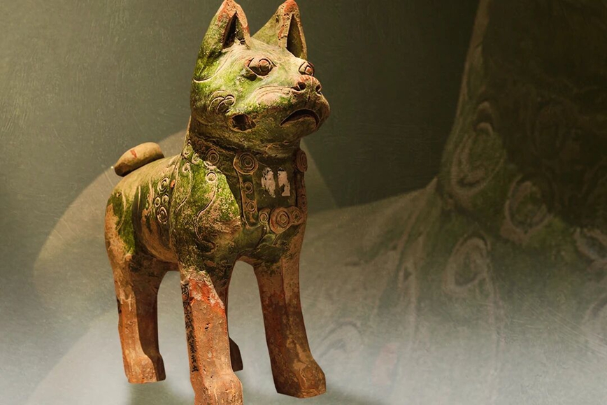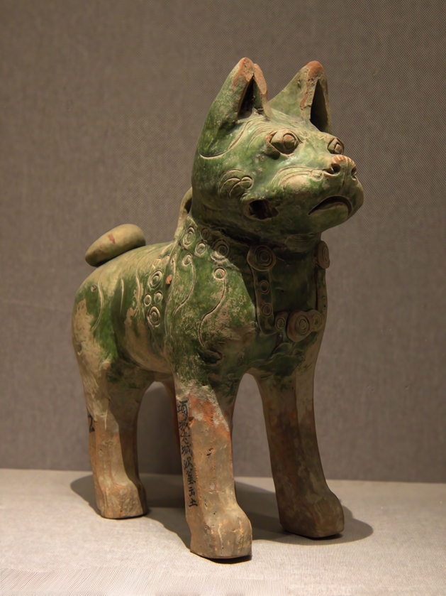河南博物館の東漢時代の緑釉陶製犬は、「千年の愛らしいペット」と称される。この陶製の小さな犬は立ち姿で、首には鈴が付き、尾は上向きに巻かれている。頭を上げてまっすぐ前を見据え、両耳をピンと立て、厳かな表情で忠実な様子。おとなしく可愛らしい姿は、まさに家を守り、主人を伴う様子を思わせ、古代人の生活に対する繊細な観察眼が存分に表れている。