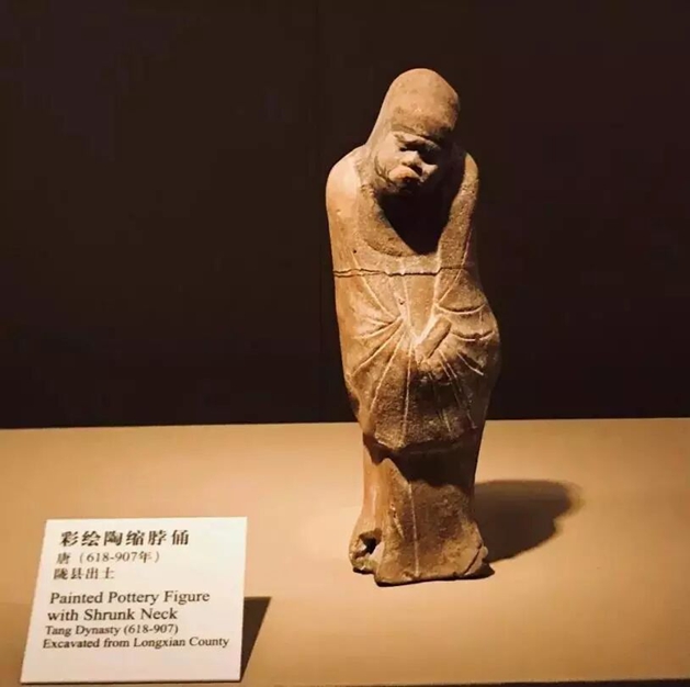 陝西歴史博物館の彩色陶器である縮こまった首の人形は、「唐代の演出家」と称されている。首を縮め、顔の表情はくしゃくしゃに皺が寄り、突き出した口元にはまるで不満げな感情が浮かんでいる。この表情が意外にも現代人の萌えポイントに直撃する。