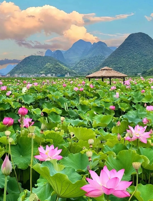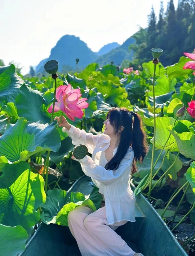 驚くべきことに、このハスの海は、300を超える孤立峰と54の湖が織りなす“水上の田園風景”の中に美しく溶け込んでいる。カルスト地形の峰々が点在し、湖は互いに連なって水路となり、山影が水面に映り込み、ハスの香りが風に乗って漂う。そこに広がるのは、まさに中国美学が描く幻想的で空気のように澄んだ風景──心がそっとほどけるような、静けさと詩情に満ちた世界である。