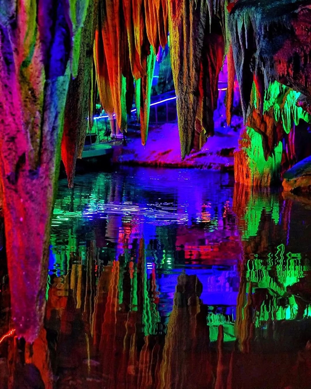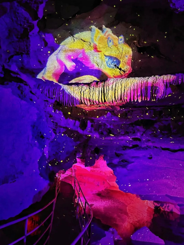 普者黒の魅力は、山や水の美しさだけにとどまらない。青龍山の麓にある「青丘画壁」は、カルスト地形の天然鍾乳洞を舞台に、『山海経』の世界をテーマとした幻想的な体験スポットである。ホログラム映像技術を駆使し、古代神話に登場する奇妙な生き物や壮麗な風景が、鍾乳石の間にまるで生きているかのように浮かび上がる。神秘とテクノロジーが融合したこの空間は、まさに時空を超えた幻想世界への入り口である。