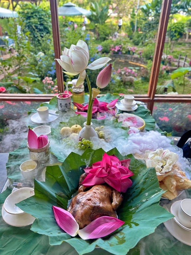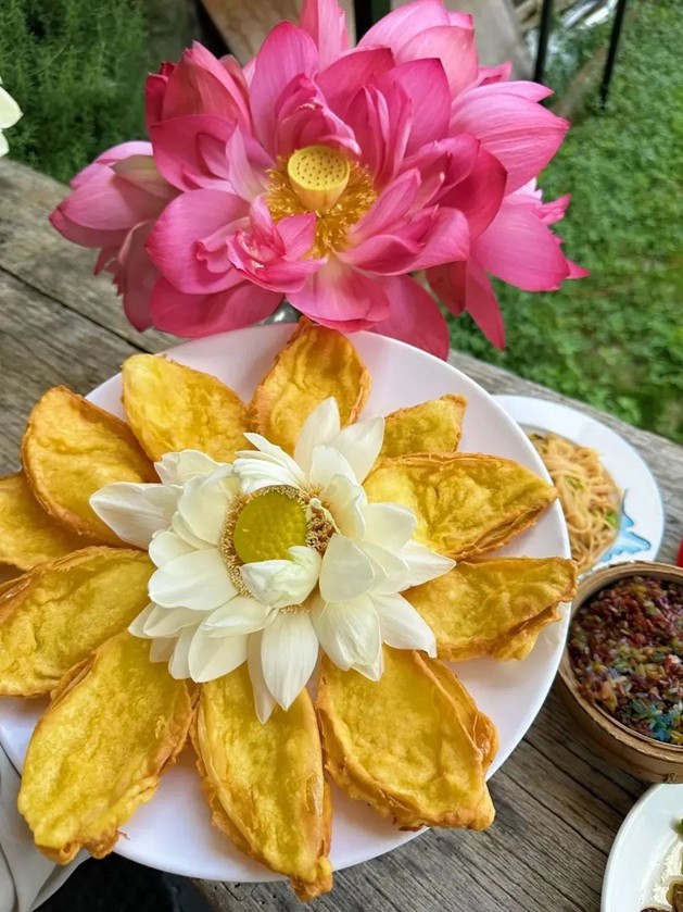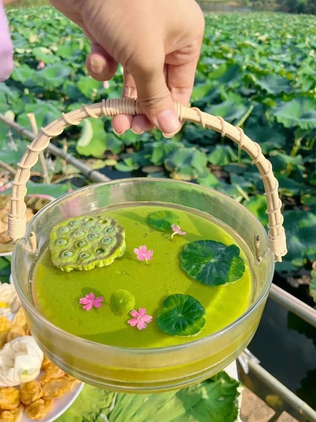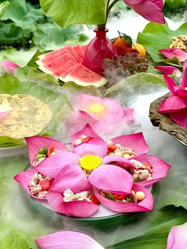 ハスの葉でじっくり煮込んだ鶏スープは、濃厚で旨味たっぷり。レンコンと豚足の煮込みは、とろけるように柔らかく、ほんのり甘い香りが広がる。ハスの花びらを使った玉子焼きは、芳ばしい香りが食欲をそそり、ハスの葉の香りをまとったご飯や、透明感あふれるハスの花ゼリー、レンコンの形をした緑豆ケーキなど、見た目にも美しい品々が並んでいる。ひと口ごとに、自然の恵みをまるごと味わえる贅沢な時間である。