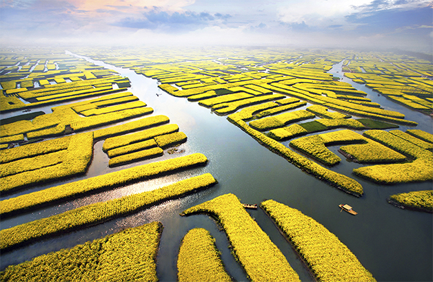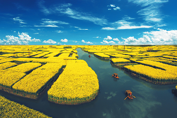 毎年の春に、興化の千の積みの景勝地の水に囲まれた「積みの畑」には菜の花がいっぱいで、四角い畑は黄金色の島のように、多く広く分布して、本当に壮観である。景勝地南口からほど近い3階建ての展望台は、はるかに見渡す景色をみる最適な場所である。階段を上って大地を見下ろすと、金色の畑が足元から地平線まで伸びている。横縦に交錯した渓谷は、花畑をさまざまな幾何学的な形にカットし、菜種の花は独立した「島」のようであるが、川を挟んで相対している。