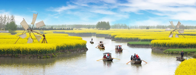 興化は、江蘇省泰州市に位置し、江淮地域にあり、里下河地域の奥地の間にある。ここの水路が網になり、川や湖で縦横に交錯し、生き生きとした水では興化の美しい風景を生み出した。世界で4大花の海の1つである「千の島のカリフラワーの風景」で特に有名である。毎年の清明祭の前後に、666.67ヘクタールの積みの畑には黄金色のアブラナが咲き、水に浮かぶまばゆいばかりの雲のように、夢のような衝撃である。